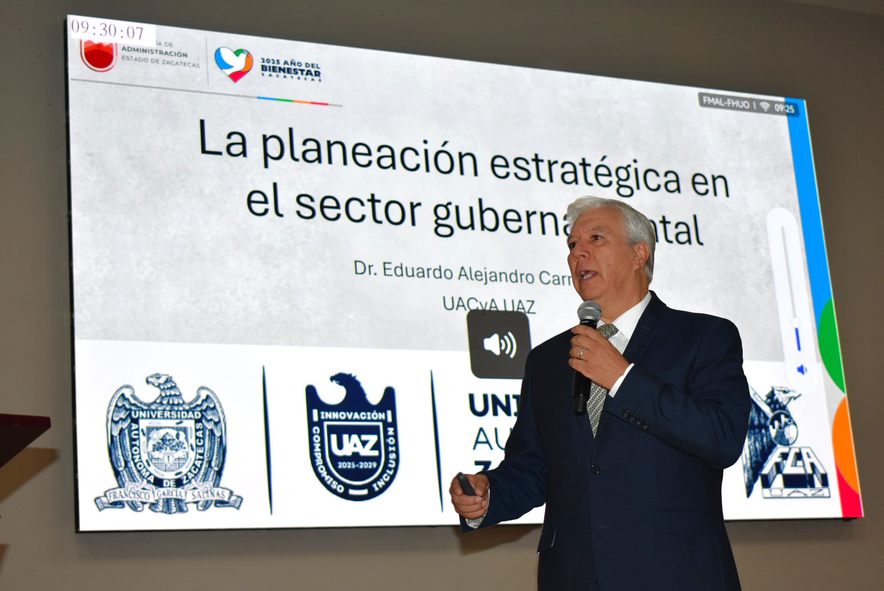 Zacatecas, Zac., 25 de septiembre de 2025.- Como parte de las acciones enmarcadas en la Agenda del Bienestar, impulsada por el Gobernador David Monreal Ávila, la administración estatal ofreció a las y los servidores públicos del Gobierno de Zacatecas la conferencia denominada Planeación “Estratégica y Bienestar Gubernamental”, impartida por Eduardo Alejandro Carmona, de la Universidad Autónoma de Zacatecas.